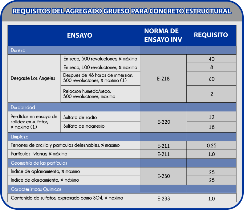 Las gravas de ¾” y ½” cumplen con los requerimientos establecidos en la norma tecnica colombiana NTC 174, Artículo 630 y 500 de las Especificaciones Generales de Construcción de Carretaras del Instituto Nacional de Vias en cuanto a exigencia en materia de limpieza y durabilidad y caracteristicas quimicas, lo cual las hace aptas para su utilización en la preparación de mezclas de concreto y mezclas asfalticas.